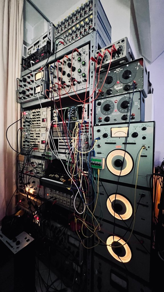 Ja, gerade so One-offs zum Beispiel. Da oben steht so ein Oberton-Synthesizer – so ein riesiges Ding. Da ist ein Pitch-Envelope-Follower drin. Der wurde von Gentle Electric in den 70er-Jahren entwickelt, aber das ganze Ding ist ein One-off für irgendeine Anwendung an der Uni, für die Audiologie. Es ist ein Oberton-Synthesizer. Das heißt, man steckt einen Ton rein und der teilt ihn in 15 Obertöne auf. Du kannst jeden dieser einzelnen Obertöne auf links und rechts verteilen und in der Phase drehen. Das war für die Oberton-Forschung gedacht. Total verrückt. Es macht eine ganz psychedelische Welt, weil es halt nicht für Musik gedacht ist. Aber es ist unglaublich.